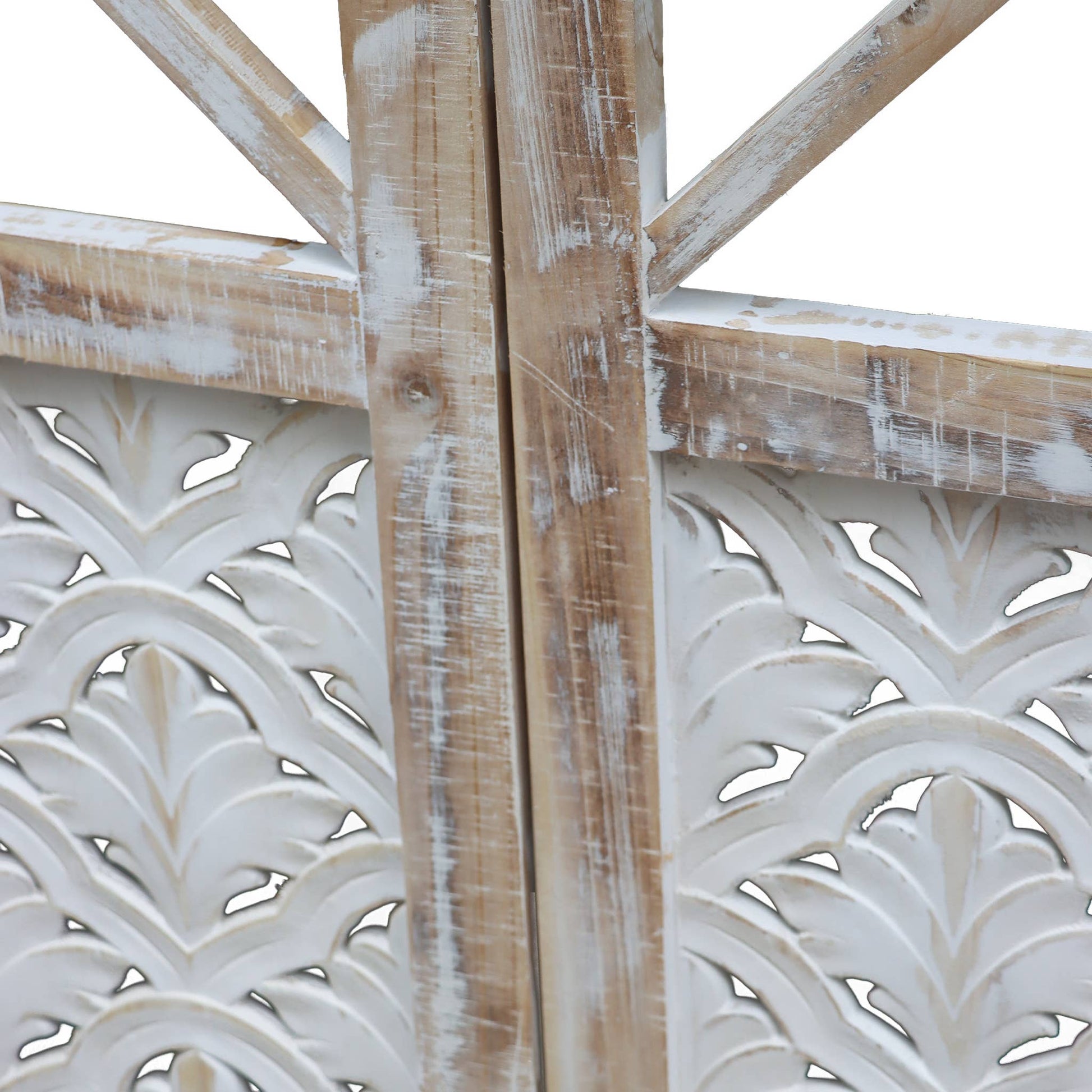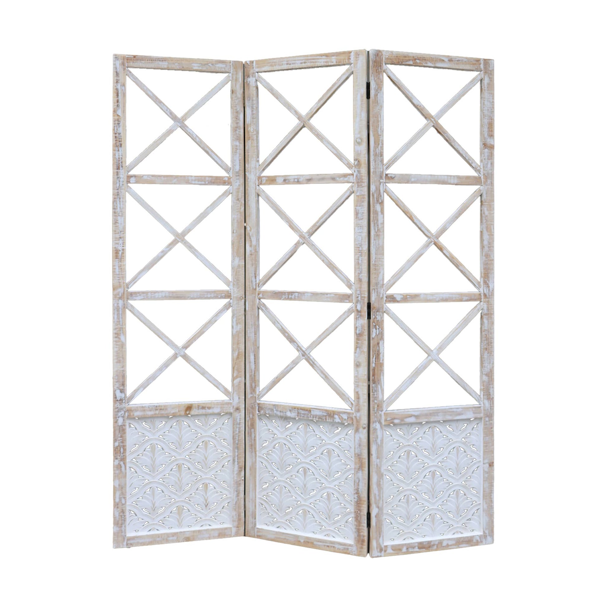 RUSTIC DESIGN: Features a distressed white-washed finish with decorative X-pattern lattice work and intricately carved floral details at the bottom panels