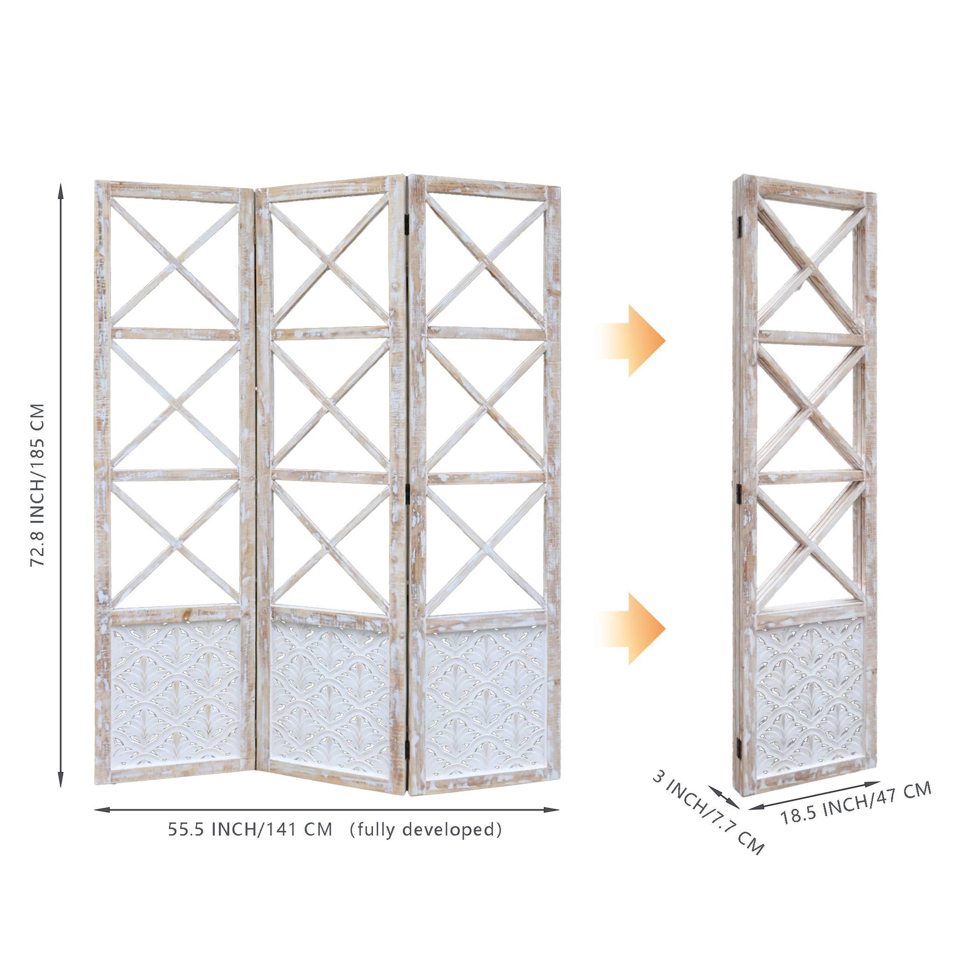 DIMENSIONS: Large 3-panel room divider measures 55.5 inches wide and 72.8 inches tall, perfect for dividing spaces in living rooms, bedrooms, or offices