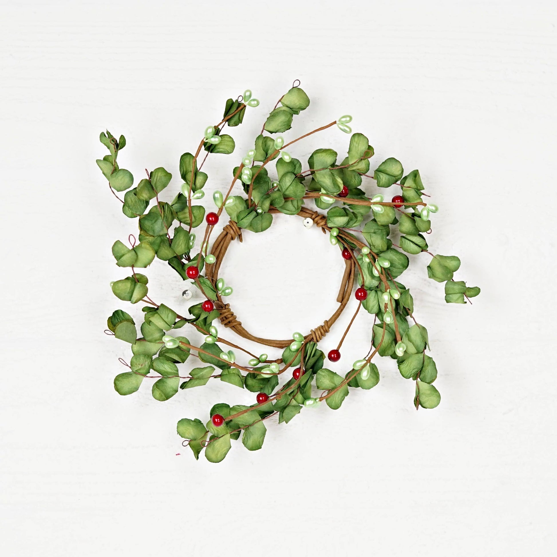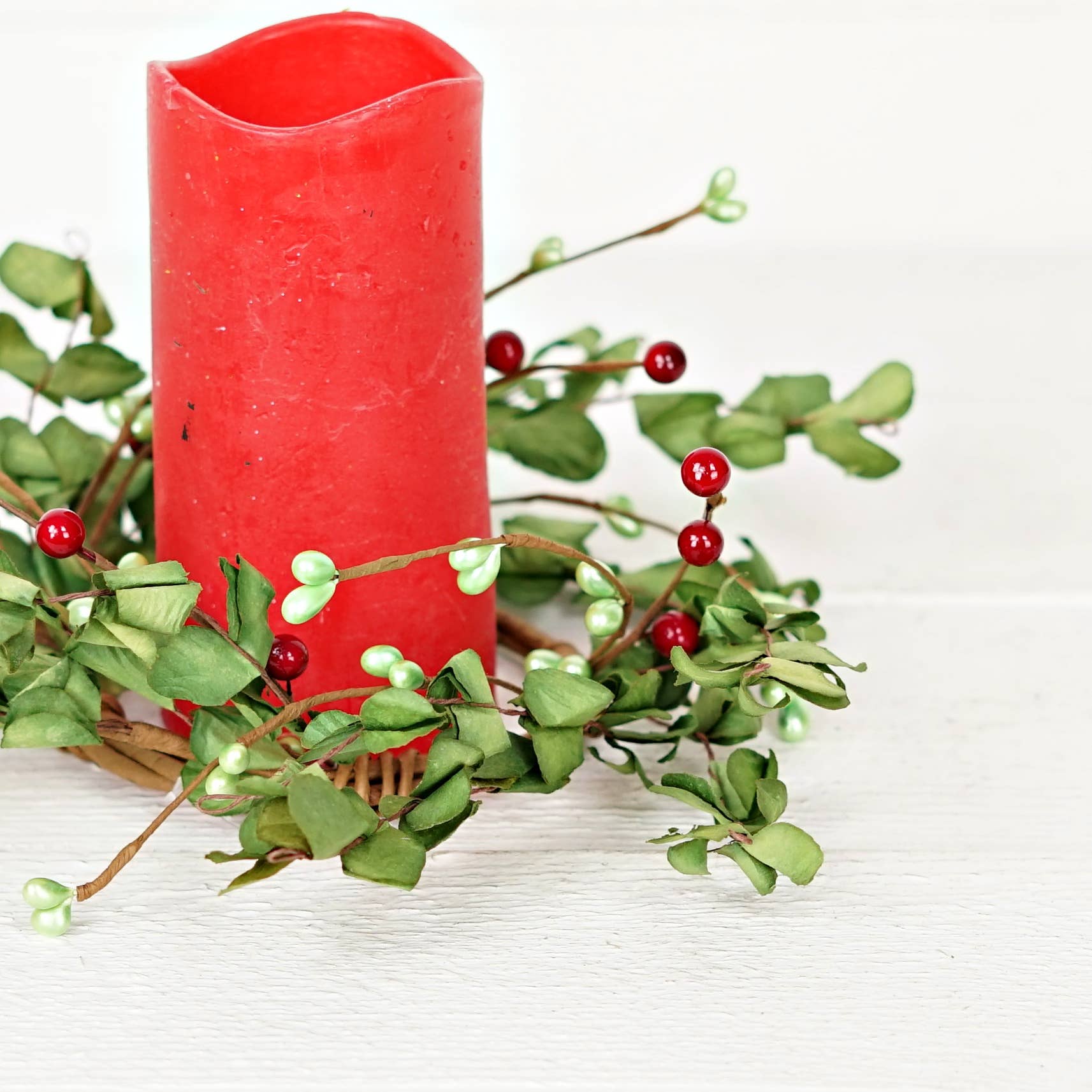 Christmas holiday ruffled green boxwood leaves with berry wreath candle ring