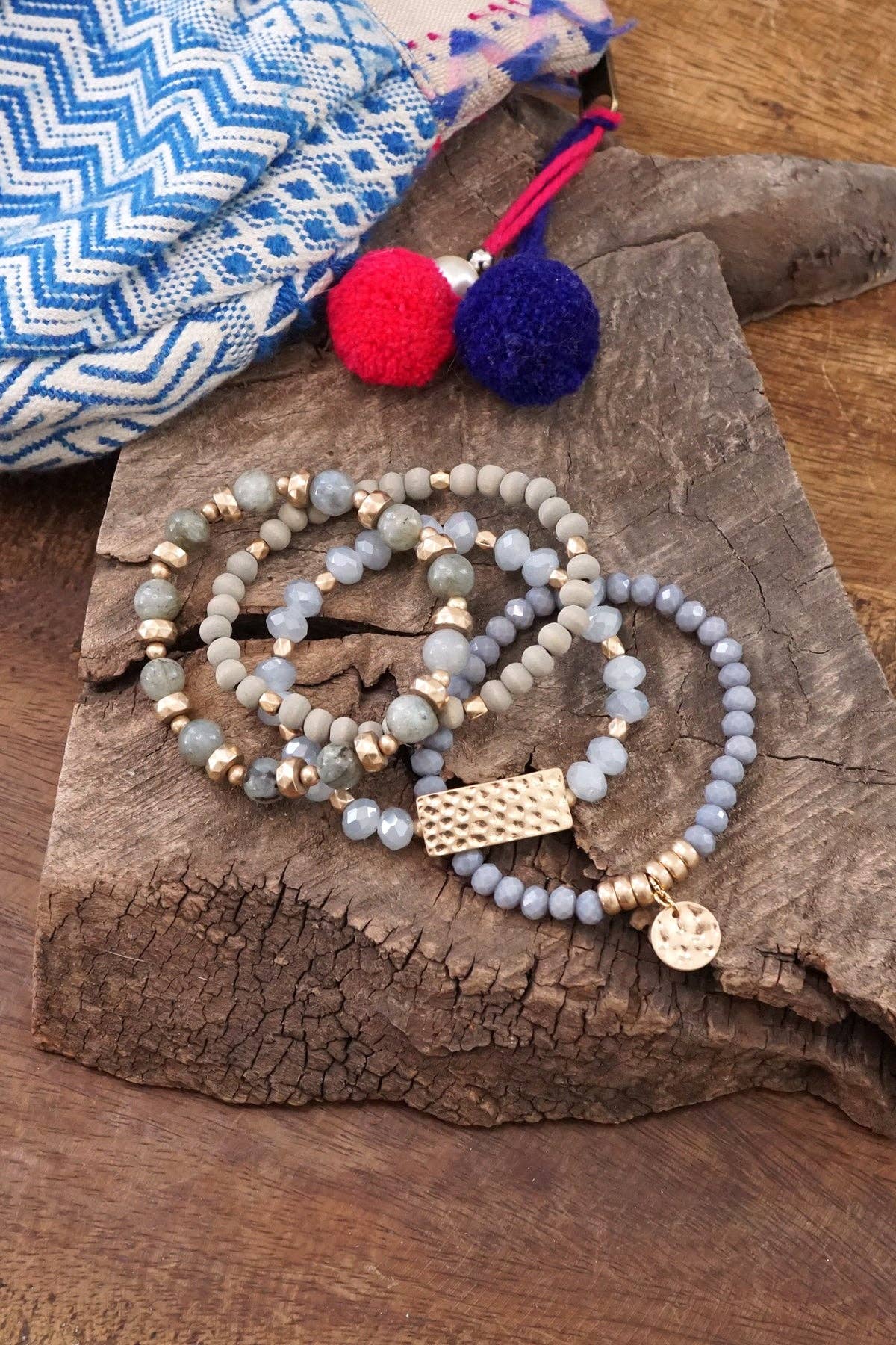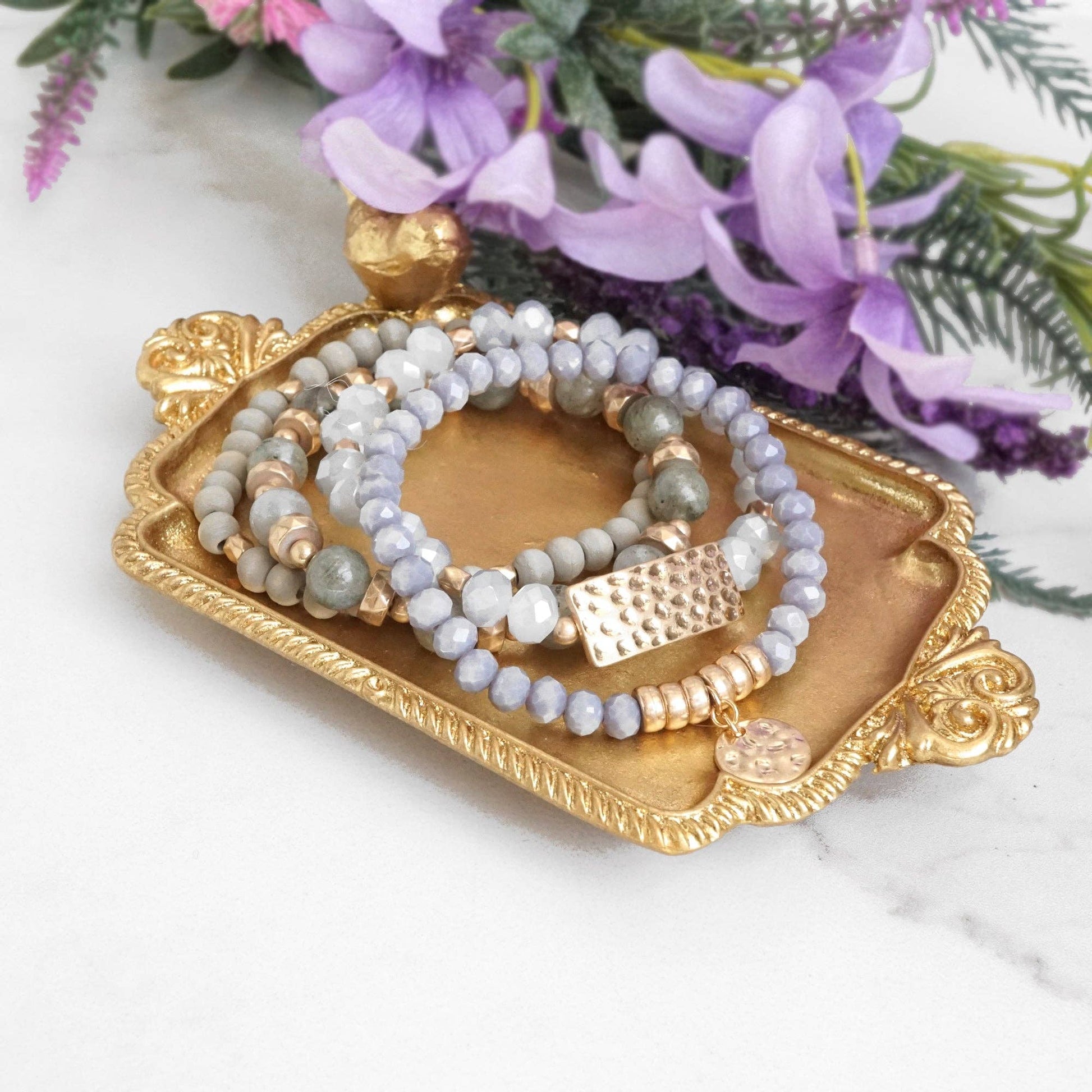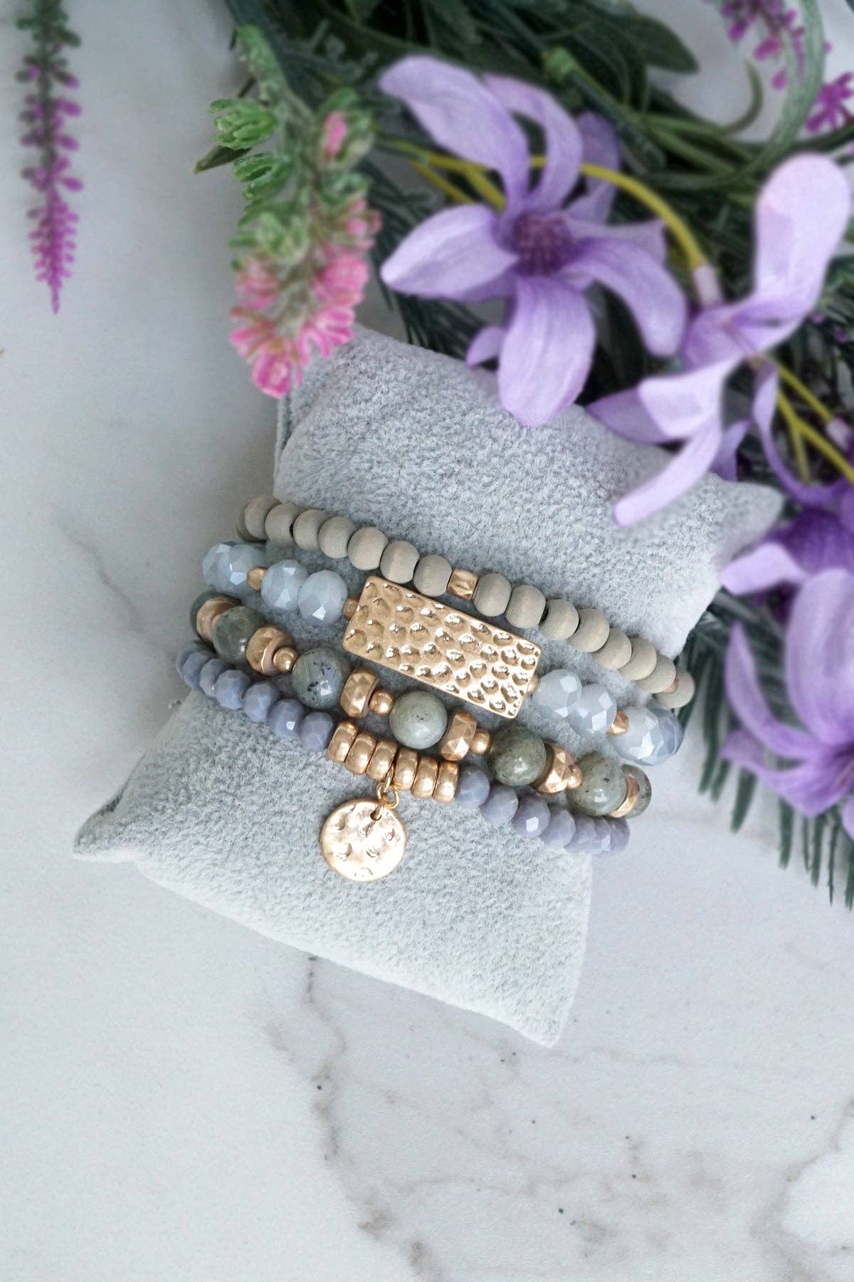 Beaded Bracelets stack of 4 piece with Gray Wood and Semi Precious bead stones glass golden coin
