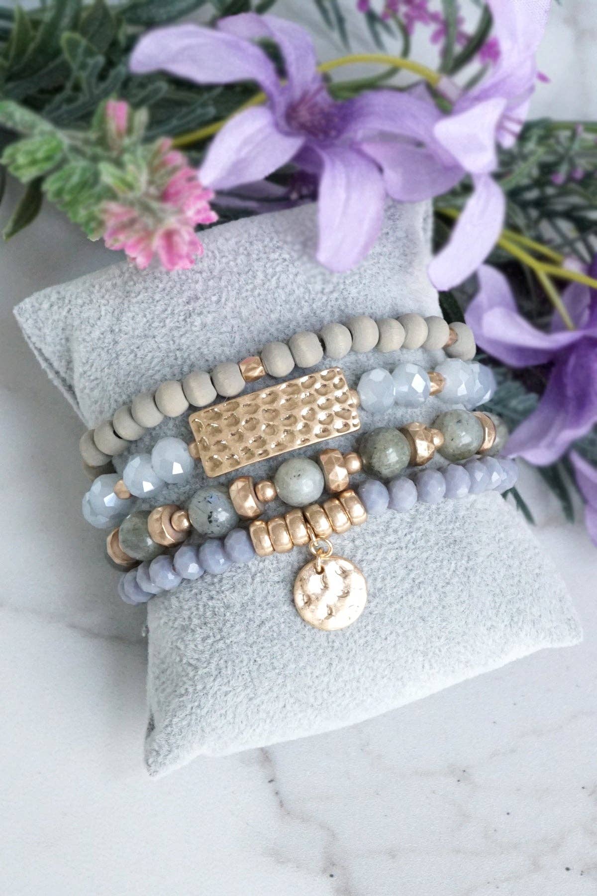 Beaded Bracelets stack of 4 piece with Gray Wood and Semi Precious bead stones glass golden coin and beads