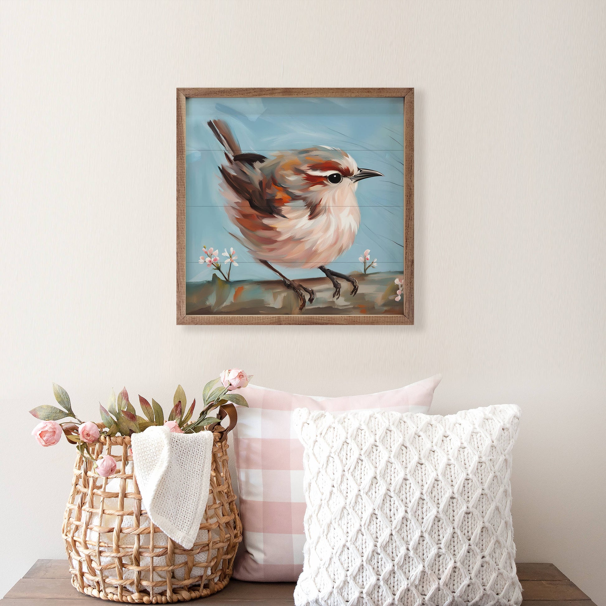 This unique piece is a simple way to bring beauty and charm to any wall or shelf within the home. It is made from high quality American hardwood planks with a hand painted face, and printed with UV cured ink, and is framed in a natural walnut frame. Each piece is unique with its own personality, marks, wood grain, and look. Easy to clean with a dry cloth.