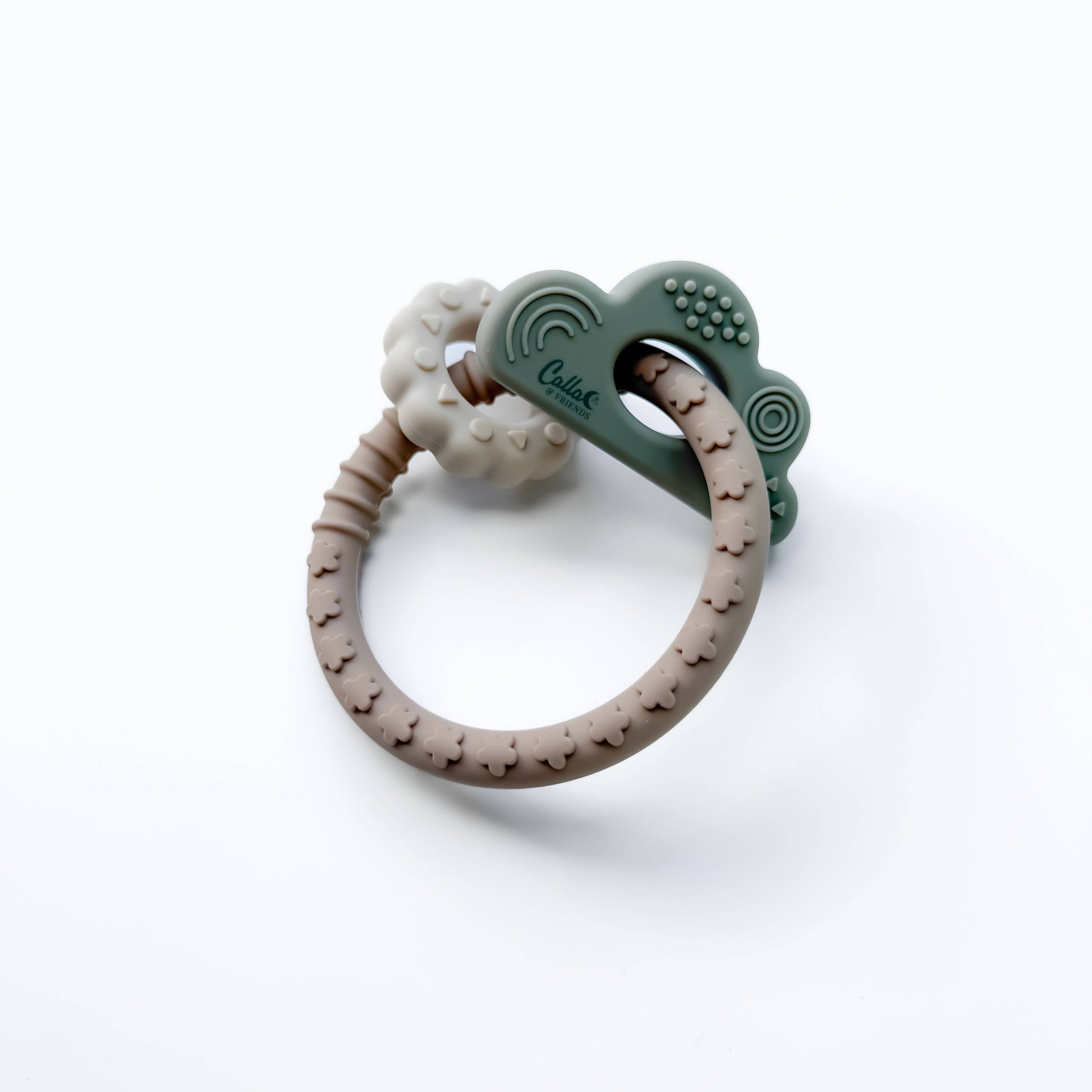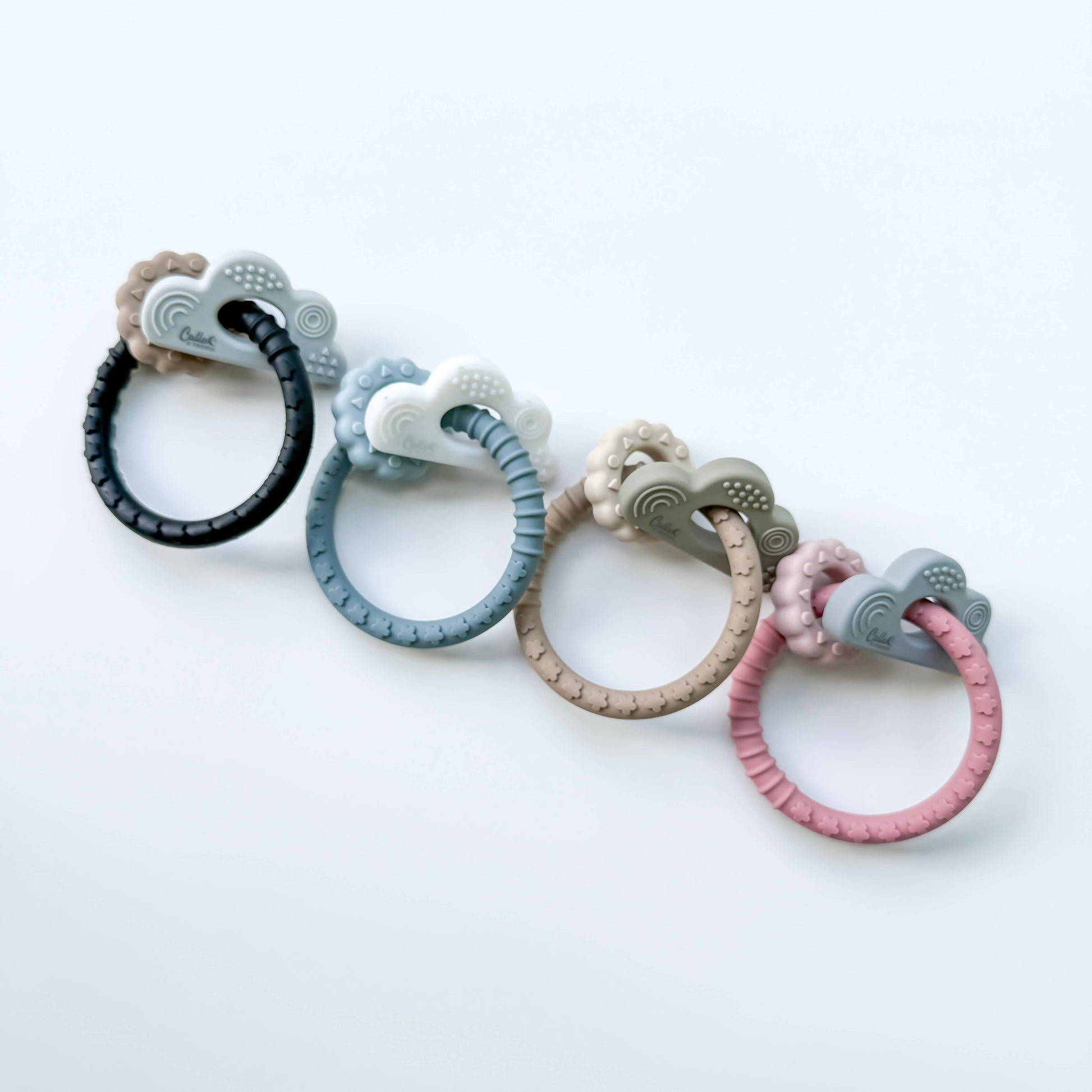 Our Cloudy Days Teether, the ultimate companion for your little one's teething journey. Made with 100% food grade silicone, this teether is not only safe but also gentle on delicate gums. The textured ring, along with the additional cloud and flower rings, provides varied sensory experiences, supporting your baby's sensory development while soothing their teething discomfort.