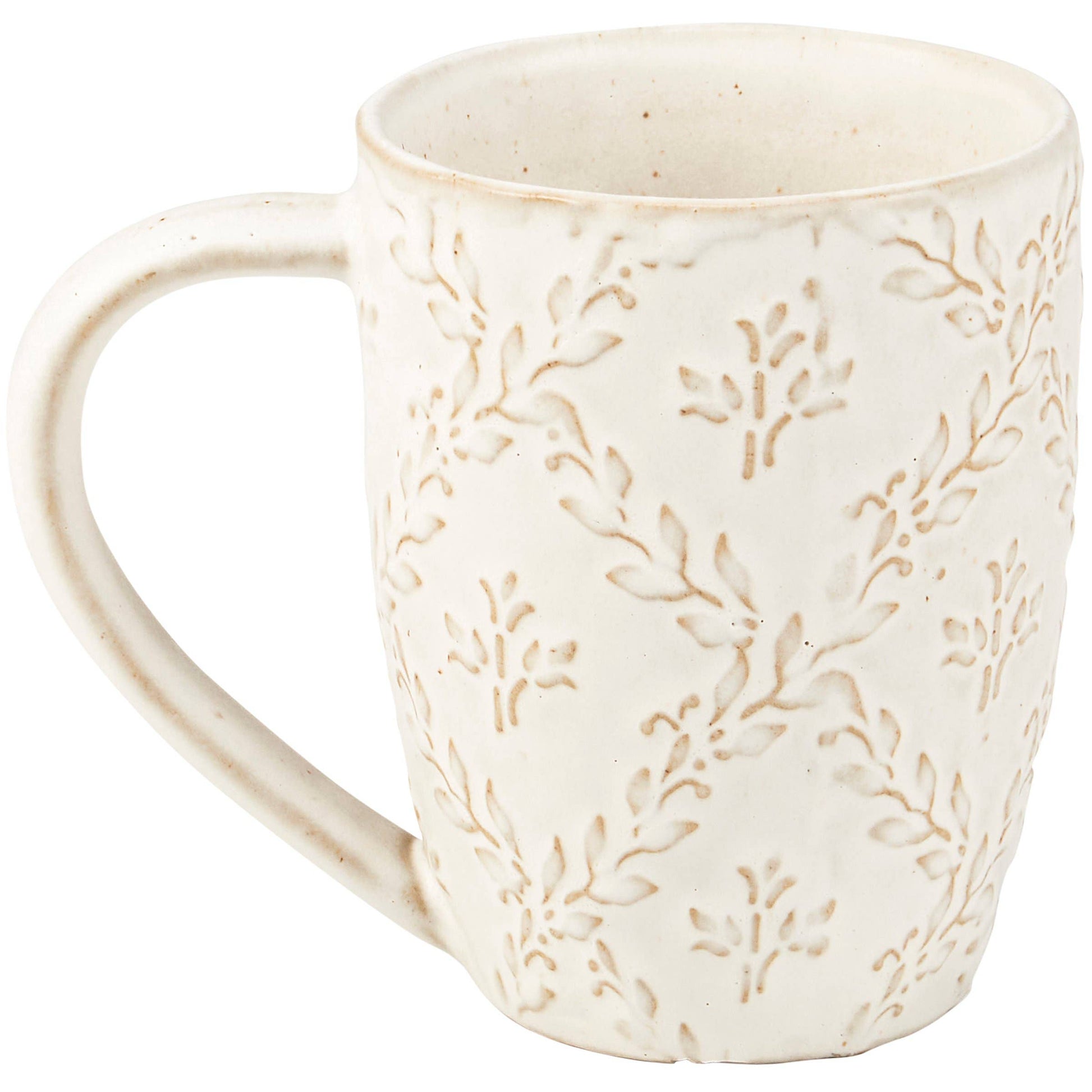 A stoneware 10 oz mug from our Cottagecore Collection displaying a cream glaze finish with embossed patterns of plant vines around the outside. Embossed vine designs come through the glaze for textured detail. Our Cottage Vine mug features a neutral color palette to easily coordinate with a variety of table décor. Hand wash only. A rustic piece of drinkware perfect for everyday gatherings.