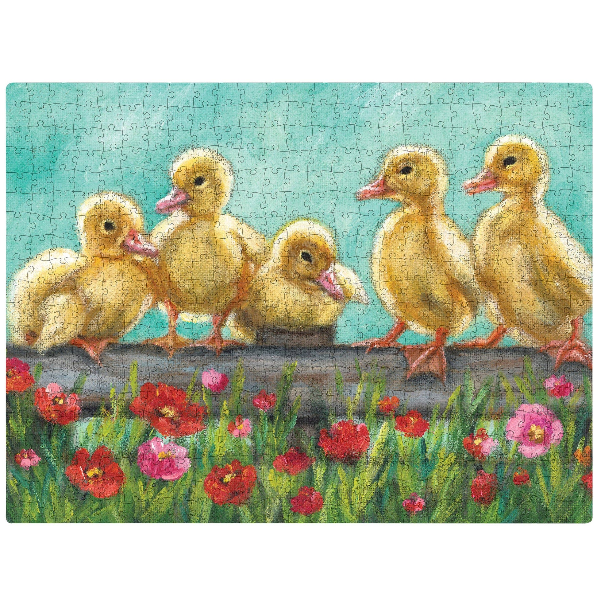 A 1,000 piece puzzle featuring a ducklings design. Design is replicated from original artwork painted onto burlap canvas, giving the art a unique depth and texture. Puzzle pieces are packaged in a resealable plastic bag and enclosed in a cylindrical box with the design wrapped around and a descriptive "Farm Friends Puzzle" sentiment on lid. Includes 10" x 8" printout of full puzzle image for reference.