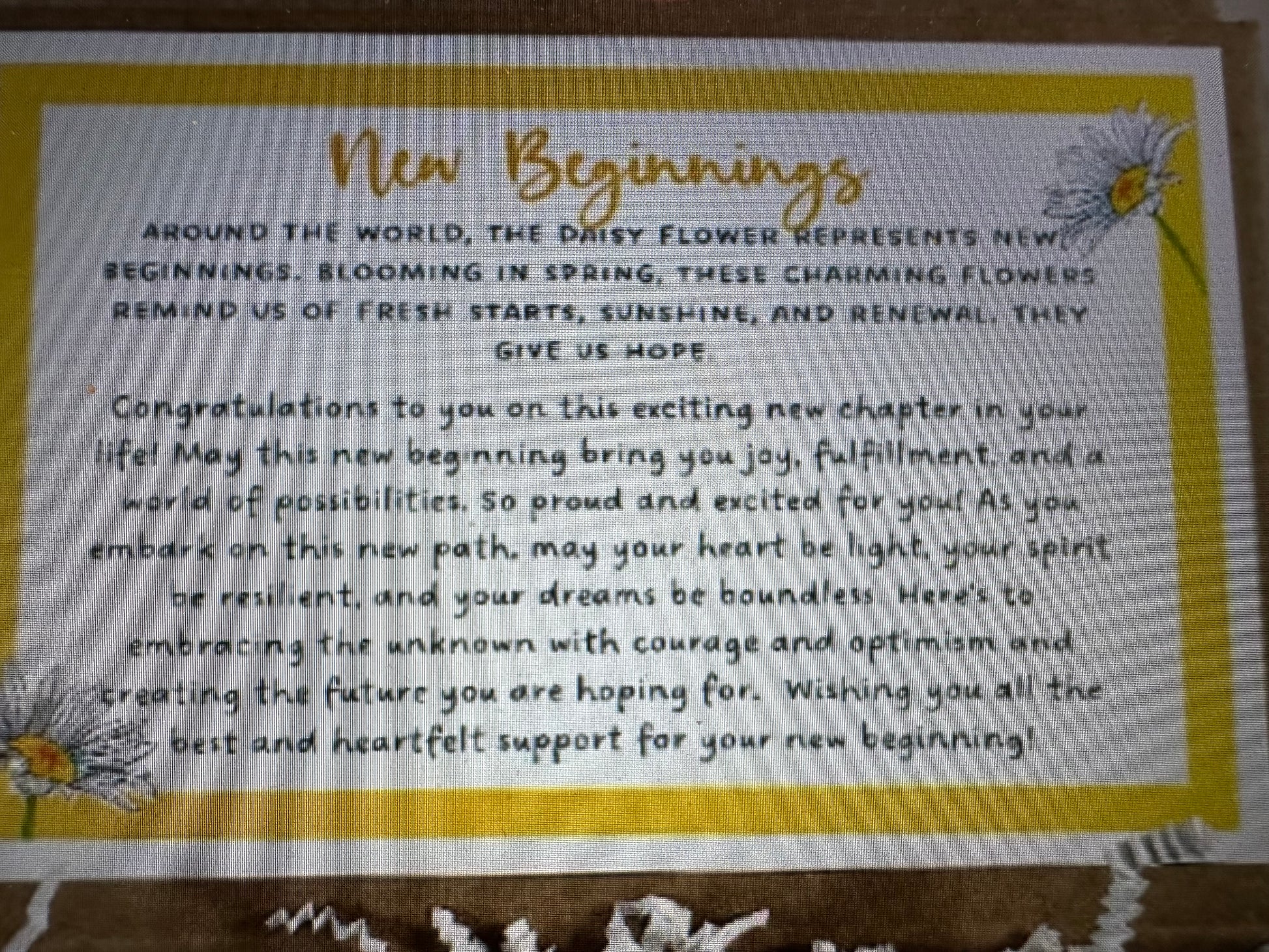 Around the world, the daisy flower represents new beginnings! Enjoy your cup of coffee in this ceramic mug. The mug comes with a card and mug wrapped in cellophane with bow.