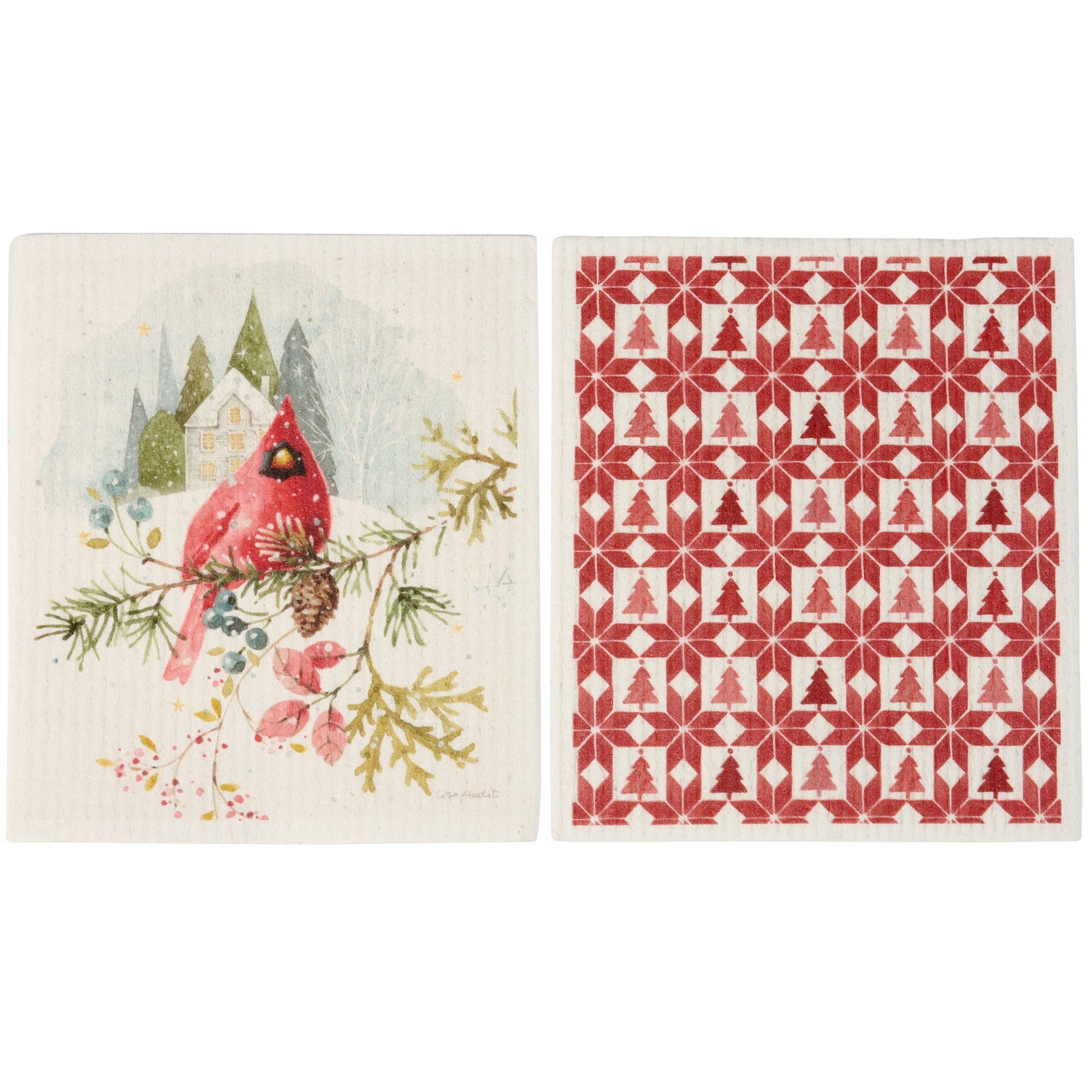 Safe to use on all types of surfaces, eco-friendly Swedish Dishcloths dry quickly and are antibacterial for more hygienic cleaning with reduced waste. This set of two Swedish Dishcloths from our Christmas Collection features a charming winter scene of a cardinal and winter inspired pattern on each dishcloth. Designs are replicated from original artwork hand painted in a delicate watercolor style. Our Winter Cardinal Swedish Dishcloth set is conveniently machine-washable for easy cleaning. Seasonal dishcloths are attached to header card with hole for easy rack display. A set of winter-themed reusable dishcloths perfect for replacing dull sponges and paper towels with long-lasting colorful designs.