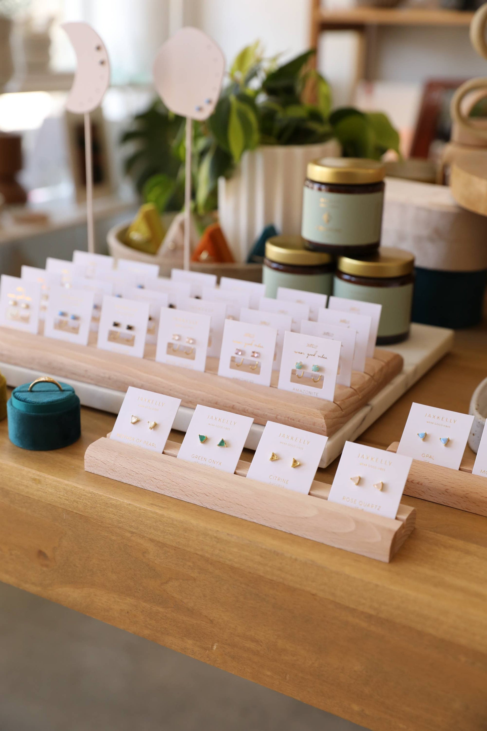 Designed to make merchandising a breeze, these are made with our pieces in mind, but you can use our JaxKelly displays throughout your shelving to create your own retail aesthetic, and let the pieces speak for themselves.